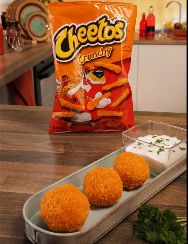 Roll them in crushed Cheetos Cheddar dust to coat.