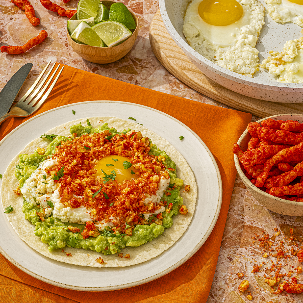 Spread mashed avocado evenly over warm tortillas. Sprinkle each tortilla with 1 tbsp CHEETOS® dust, then top with feta-fried egg. Garnish with cilantro. Serve with lime wedges if desired.