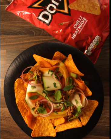 Crunchy Doritos topped with fresh marinated vegetables, shaved carrots and zucchini, lentils, and fresh herbs for a colorful, healthy snack or salad.