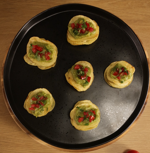 Stacked Lay's chip bites layered with guacamole and hummus, topped with tomato and coriander.