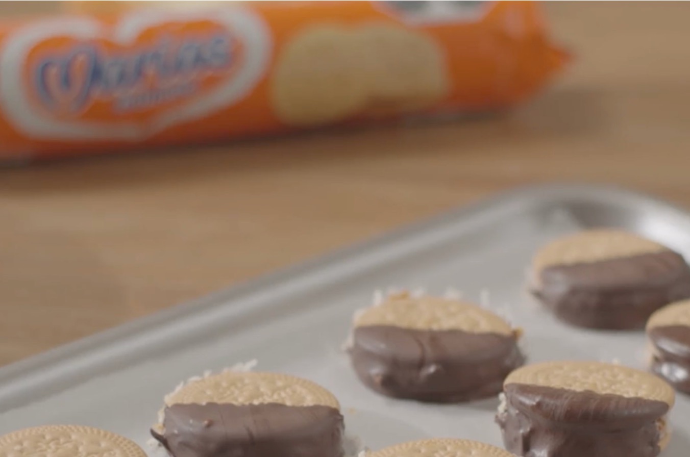 Sweet and nutty no-bake alfajores Marias Gamesa® cookies filled with dulce de leche, rolled in coconut, and dipped in chocolate.