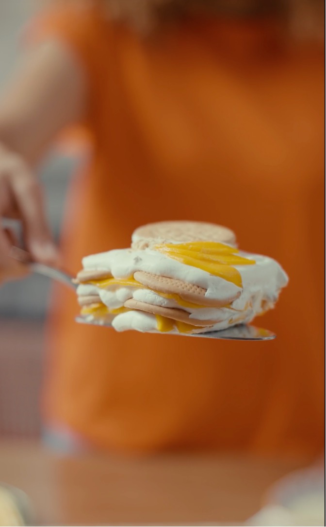 In a baking dish, arrange a layer of cookies, then a layer of the whipped cream mixture, and finally a layer of mango slices.