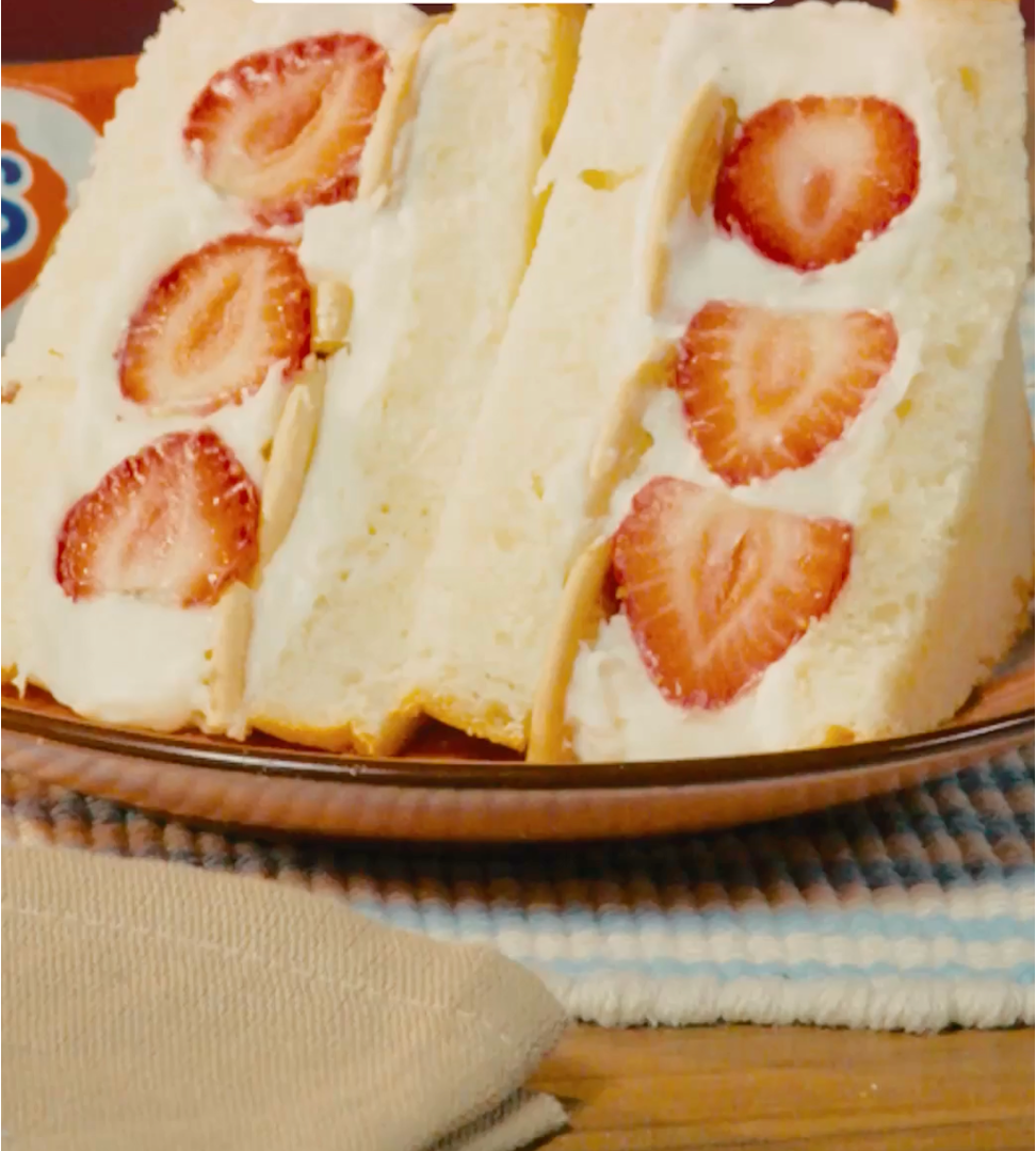 Remove the wrap, cut the sandwich diagonally, and show off the layers of bread, cookie cream, and fresh strawberries.