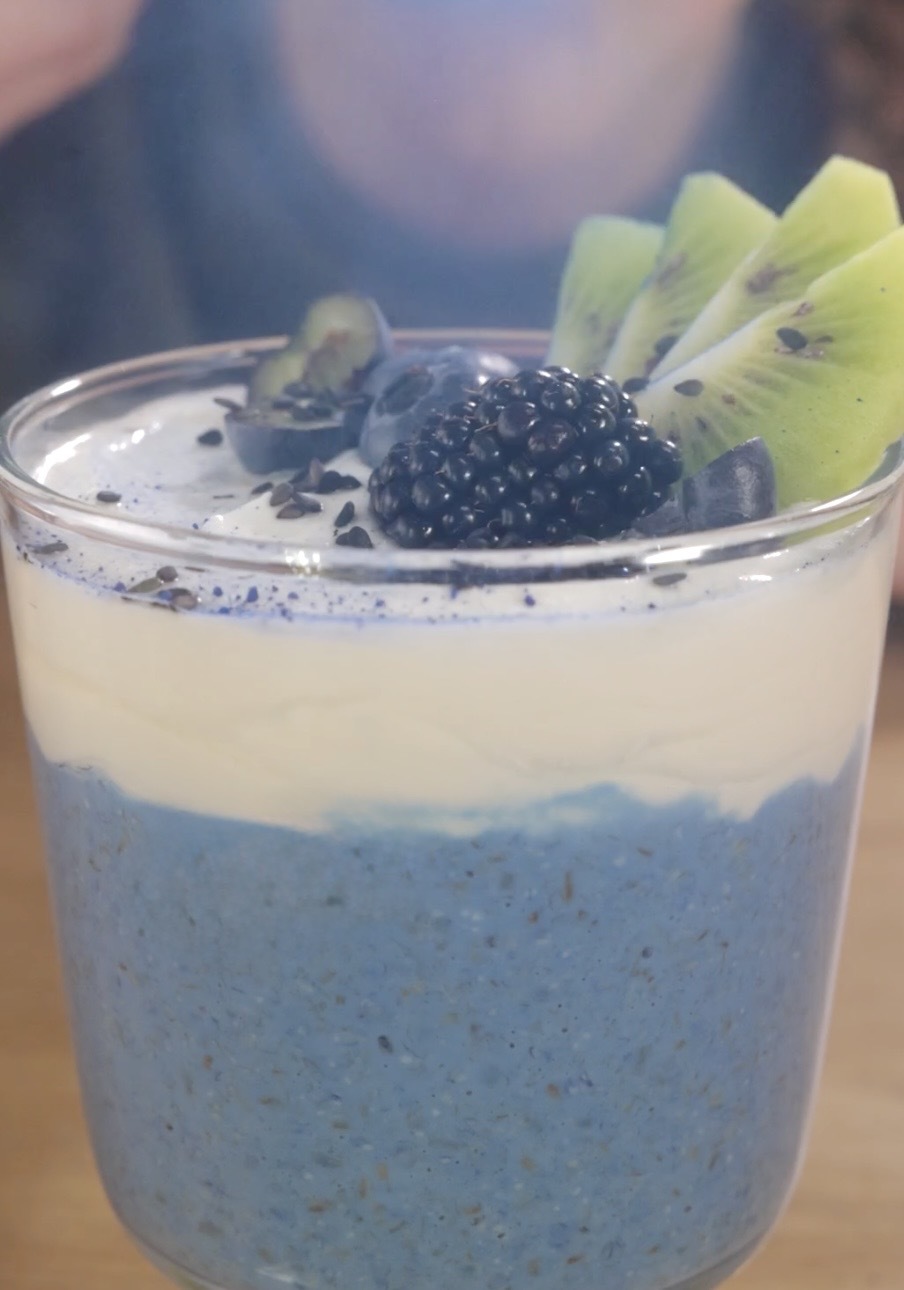 Overnight oat parfaits with spirulina, layered with creamy yogurt topping and fresh kiwi, berries, and seeds for a vibrant, nutritious breakfast.