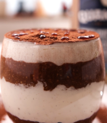 Spoon 2 tablespoons of the coffee oats into a glass, then top with a layer of mascarpone cream. Add another layer of the coffee oats, and finish with a little more cream on top.